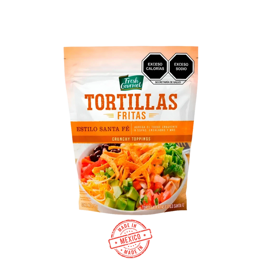 Crujientes tiras horneadas de maíz nixtamalizado estilo “Santa Fe” que aportan textura y sabor sin...