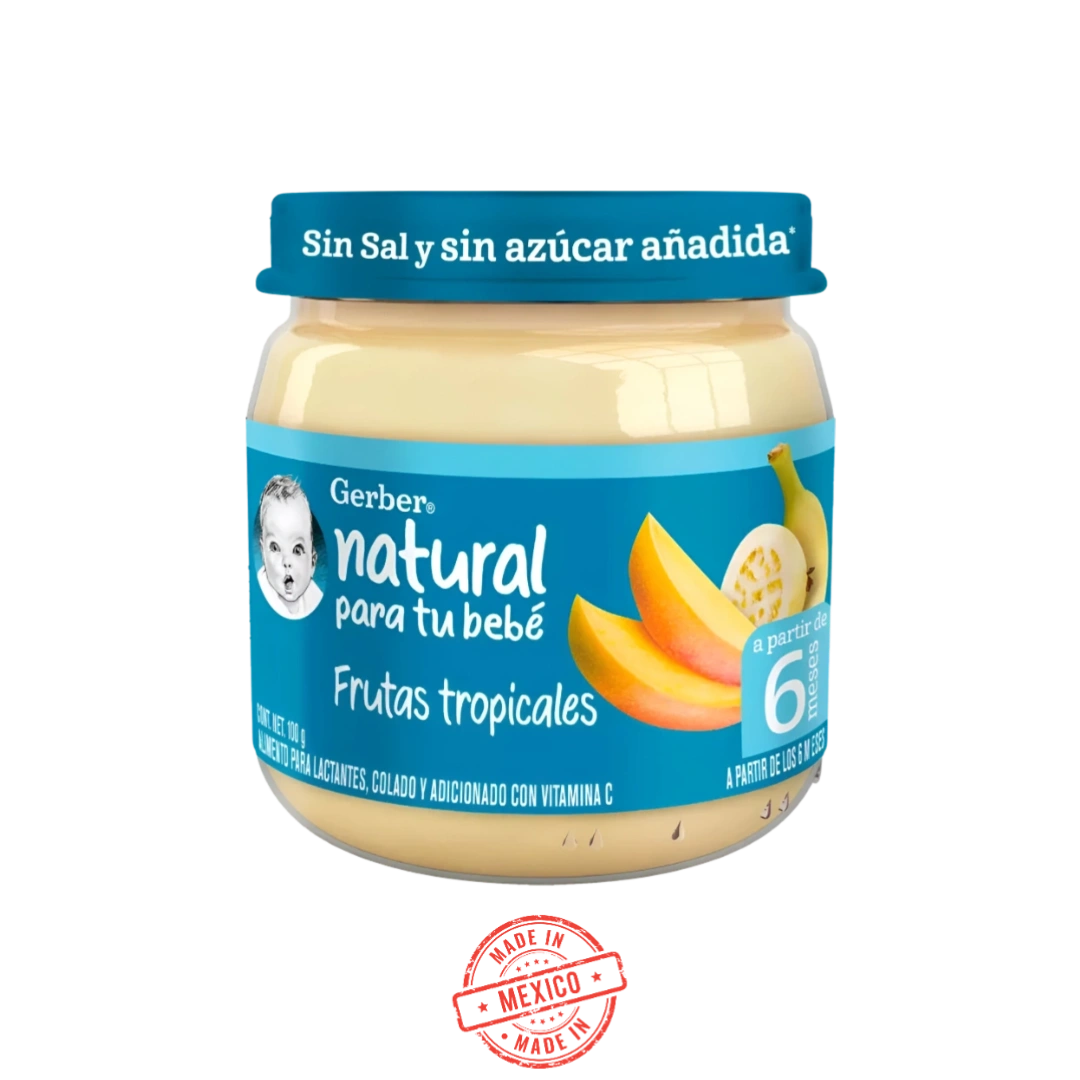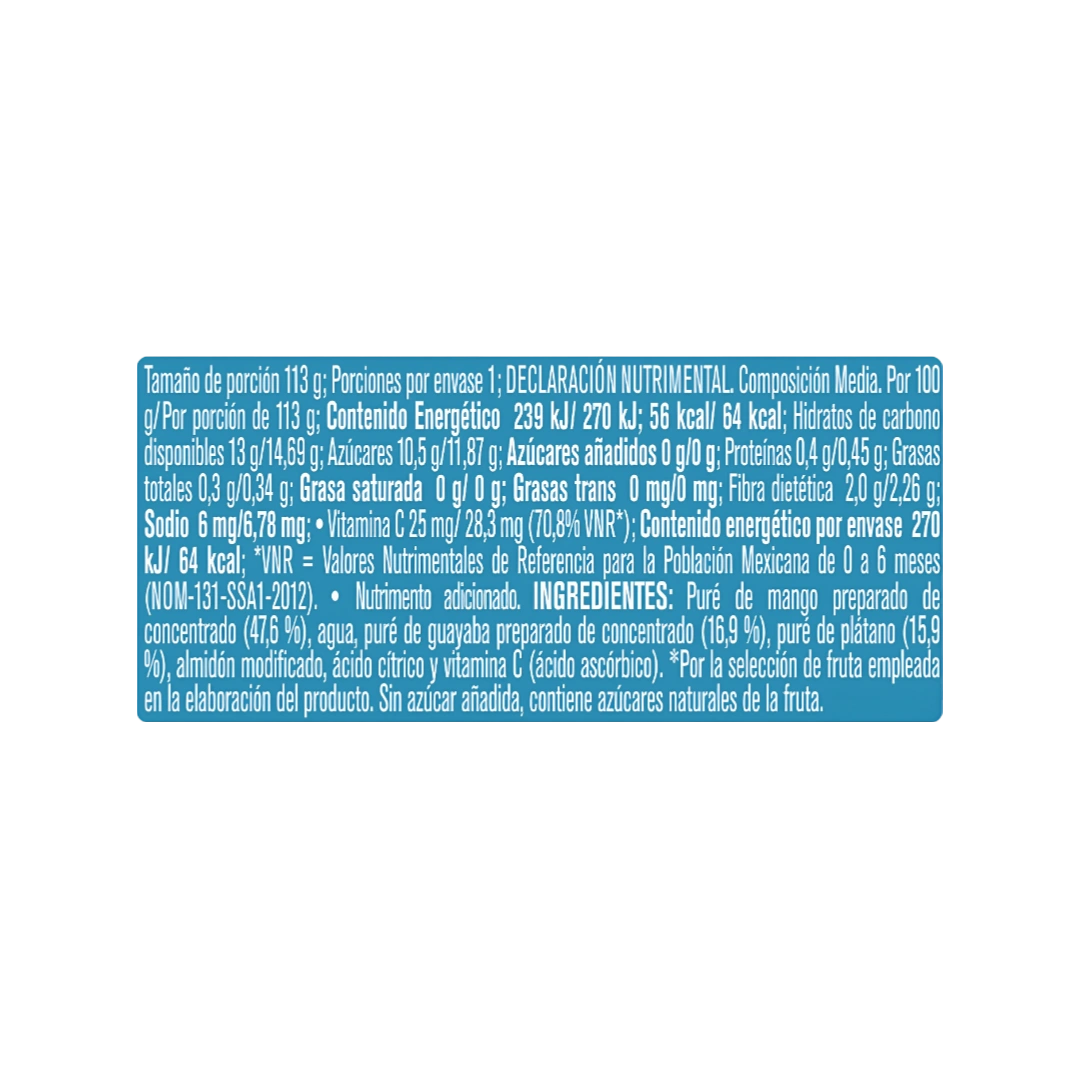 Puré de mango preparado de concentrado (47.6%), agua, puré de guayaba preparado de concentrado (16.9%), puré de plátano (15.9%), almidón modificado, ácido cítrico y vitamina C (ácido ascórbico)