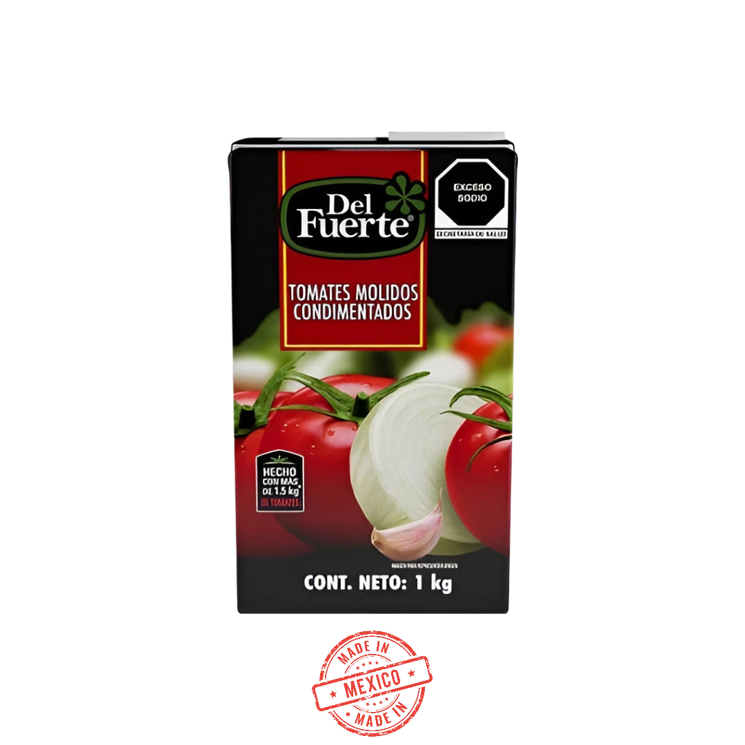 Tomates Molidos Del Fuerte Sazonados 1L es un puré de tomate listo para usar, sazonado con ajo, cebolla y pimiento morrón, ideal para preparar platillos mexicanos como enchiladas, arroz rojo o tinga. Además, está libre de conservadores, ofreciendo un sabor natural y auténtico.