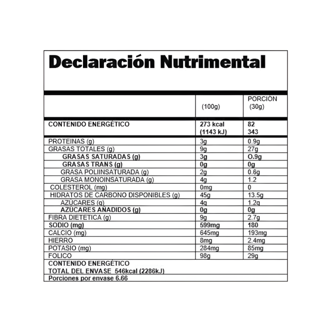 Harina de maíz nixtamalizada, nopal en polvo, inulina de achicoria, fibra vegetal, hidróxido de calcio, sazonador chile limón (chile guajillo, chile de árbol, ácido cítrico, sal yodada) y aceite vegetal comestible puro de maíz