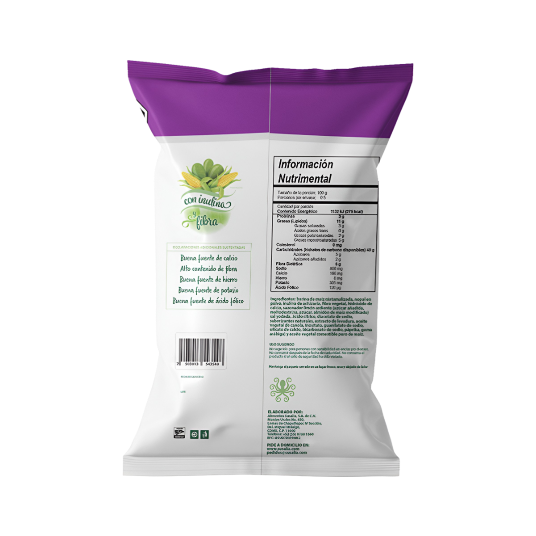 Harina de maíz nixtamalizada, nopal en polvo, inulina de de achioria, fibra vegetal, hidróxido de calcio, sazonador de limón ardiente (azúcar añadida, maltodextrina, azúcar, almidón de maíz modificado) sal yodada, ácido cítrico, diacetato de sodio, saborizantes naturales, extracto de levadura, aceite vegetal de canola, inositato, guanilatato de sodio, silicato de sodio, paprika, goma arábiga) y aceite vegetal comestible puro de maíz.